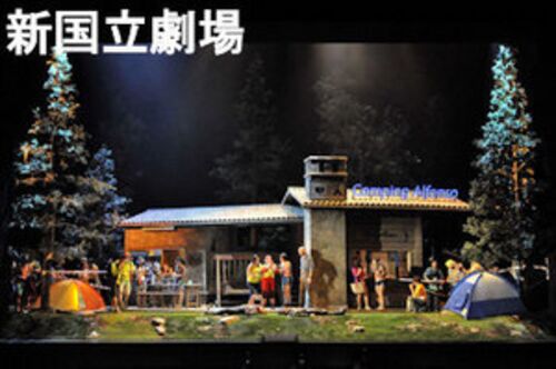 [オペラ] モーツァルト『コジ・ファン・トゥッテ』、新国立劇場(写真右は、キャンプ場の事務所、下は、キャンプ場内の池とキャンピングカー。池の縁に腰掛けたデスピーナ(中央)は両側の姉妹に「不倫しちゃおうよ」と煽りまくる。キャンピングカーは、たぶん…