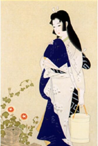 [今日のうた18] 10月1日〜31日 (挿し絵は江戸時代の俳人、加賀千代女(志村立美画)、「朝顔やつるべ取られてもらひ水」が有名だが、今月のような遊び心のある滑稽句も作った) ・ 白装(びやくさう)の端(はし)ものこさず角曲がる (山口誓子1952、秋祭りだろうか…