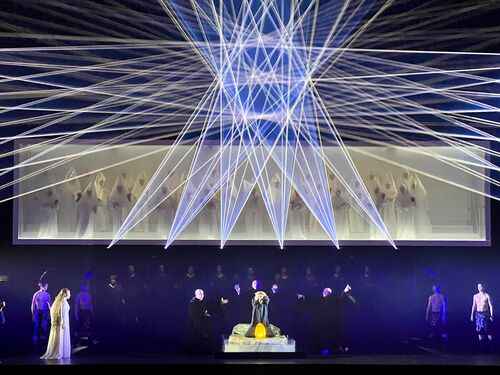 [オペラ] プッチーニ≪トゥーランドット≫ 二期会 文化会館 2月26日 (写真↓は舞台、レーザー光線?が交錯する舞台が美しい、下の写真の中央の金色円形の中がトゥーランドット姫、その下がカラフ王子) ダニエル・クレーマー演出で、音楽は、アルファーノ版では…